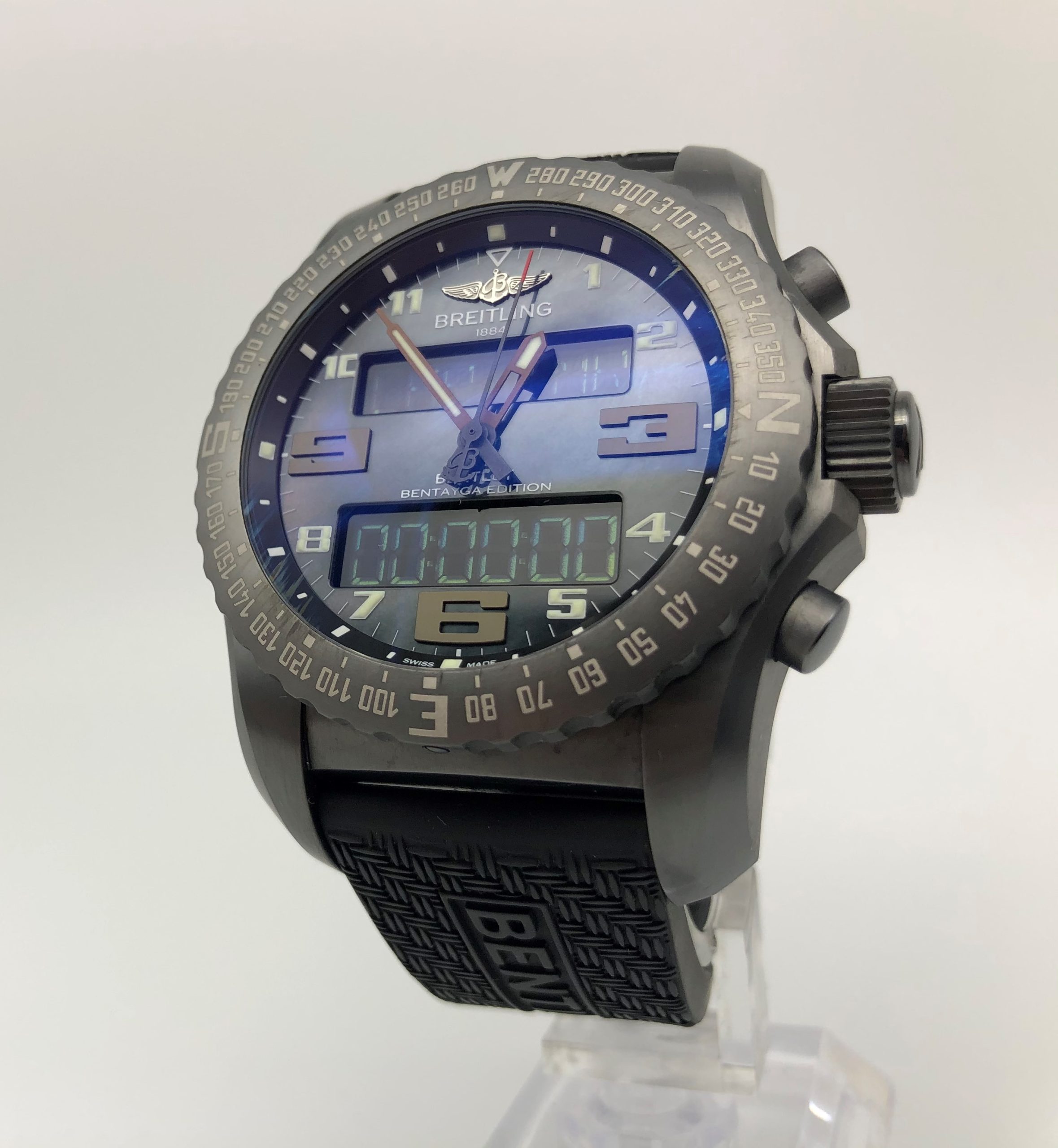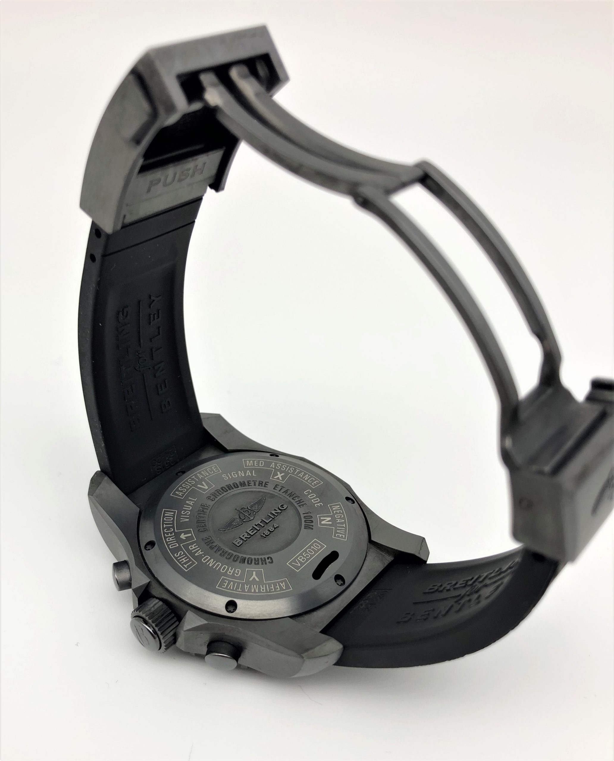 INFO: Diese Spezialserie Bentley Cockpit B50 Uhr war nicht in Breitling-Boutiquen erhältlich. Die war beim Kauf 2016 erschienenen Bentley Bentayga SUV in Erstausgabe angeboten. BREITLING Bentley Bentayga Cockpit B50 MIDNIGHT CARBON verfügt über schwarzen Perlmutt-Zifferblatt und schwarzen Kautschukband mit speziellen Mustern, die vom Innenraum des Fahrzeugs inspiriert worden sind.